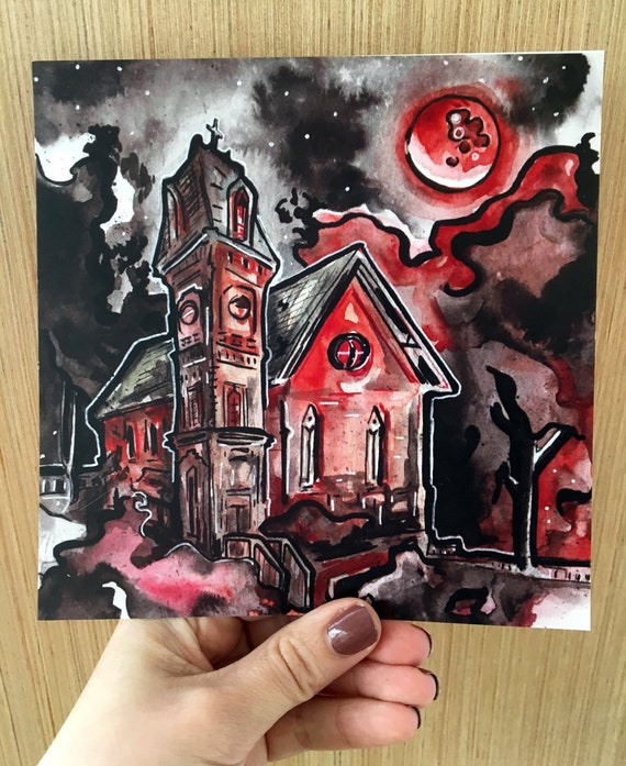 Creepy Art Blood Moon Painting Horror Story Art Halloween No Sleep Podcast Art Print Creepy Church Under Full Moon Scary Story Art