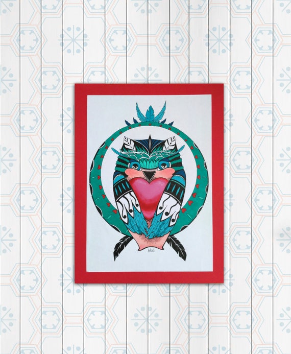Valentine S Owl Drawing Original Art Work Owl In Love Wall Decor Valentines Painting Cute Owls Red Heart Turquoise Picture Zentangle